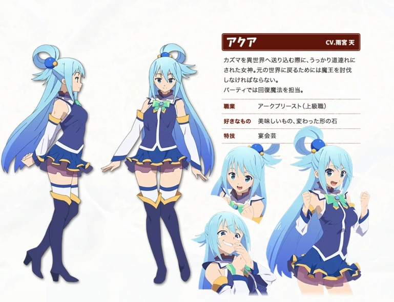 Aqua (アクア, Akua) ist einer der drei Haupt-Deuteragonisten in der KonoSuba-Serie. Vor dem Leben in der Fantasy-Welt, war sie eine Göttin des Wassers, die Menschen ins Jenseits geführt; innerhalb, wird sie von des Axis Orden verehrt.