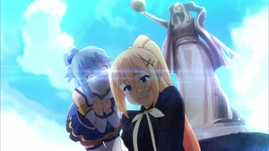 Aqua wird als Kazumas Schummelobjekt in die Welt heruntergebracht. Die beiden arbeiten in verschiedenen Teilzeitjobs; Aquas Dummheit und ihre reinigende Kraft sorgen oft dafür, dass sie gefeuert werden, aber als Muse der Künste zeichnet sie sich bei der Arbeit auf dem Bau aus. Während dieser Zeit schliefen die beiden zusammen in den Ställen. Schließlich beginnen sie, mit unterschiedlichem Erfolg, Abenteuer zu erleben.