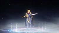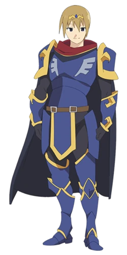 Unter seiner Rüstung trägt er ein schwarzes, enganliegendes Gewand, und ein gleichfarbiger Umhang hängt von seinen Schultern herab. Ein loser schalartiger roter Kragen bedeckt seinen Halsbereich, und auf seinem Kopf, der teilweise von seinem Haar verdeckt wird, trägt er einen goldenen Ring mit einem blauen Juwel in der Mitte. Insgesamt erinnert seine Erscheinung an einen Ritter in glänzender Rüstung oder einen charmanten Prinzen.
