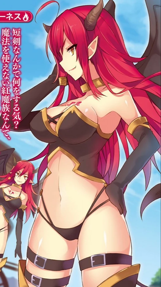 Как и у прочих демонов, у неё есть заострённые уши, рога и черные крылья, напоминающие крылья летучей мыши.