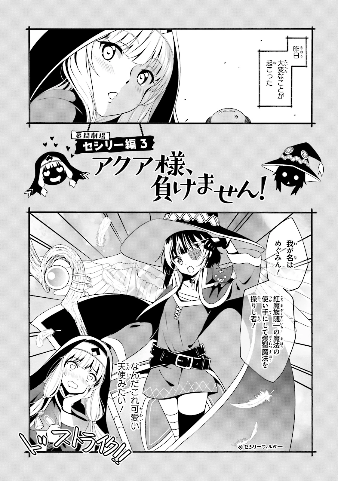 Zesta who waits for a target tells Megumin that a girl is approaching, so Megumin runs out and trips over, before acting like she injured her leg, only to discover the girl is actually Yunyun. Playing dead as an annoyed Yunyun interrogates her about what she is doing, Megumin gets rolled around by her rival. She then wonders if Yunyun is here due to being worried about her, which Yunyun tries to deny. Zesta subsequently comes out, and on the way back to the main cathedral reveals to Yunyun, who introduces herself as Megumin's rival, how Megumin was helping him recruit people for his church. As they arrive at the cathedral, however, a female knight accompanied by a team of policemen declares her intent to arrest him.