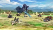 Following his army being wiped out by Megumin's Explosion, Beldia was surrounded and attacked by a number of adventurers, yet by throwing his head into air to observe the whole battlefield, he was able to deftly cut them all down. He next cursed the mages attacking him, then began cutting at Darkness who despite unable to hit him fantasized in a way unnerving to him, before defying Kazuma and other Thieves' attempts to Steal his sword.