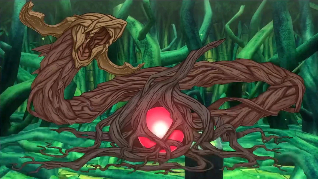 The Guardian of the Great Tree looks like a huge serpent formed from twisting branches sporting a bladed head, with its root growing around a large glowing red orb that is its power source.