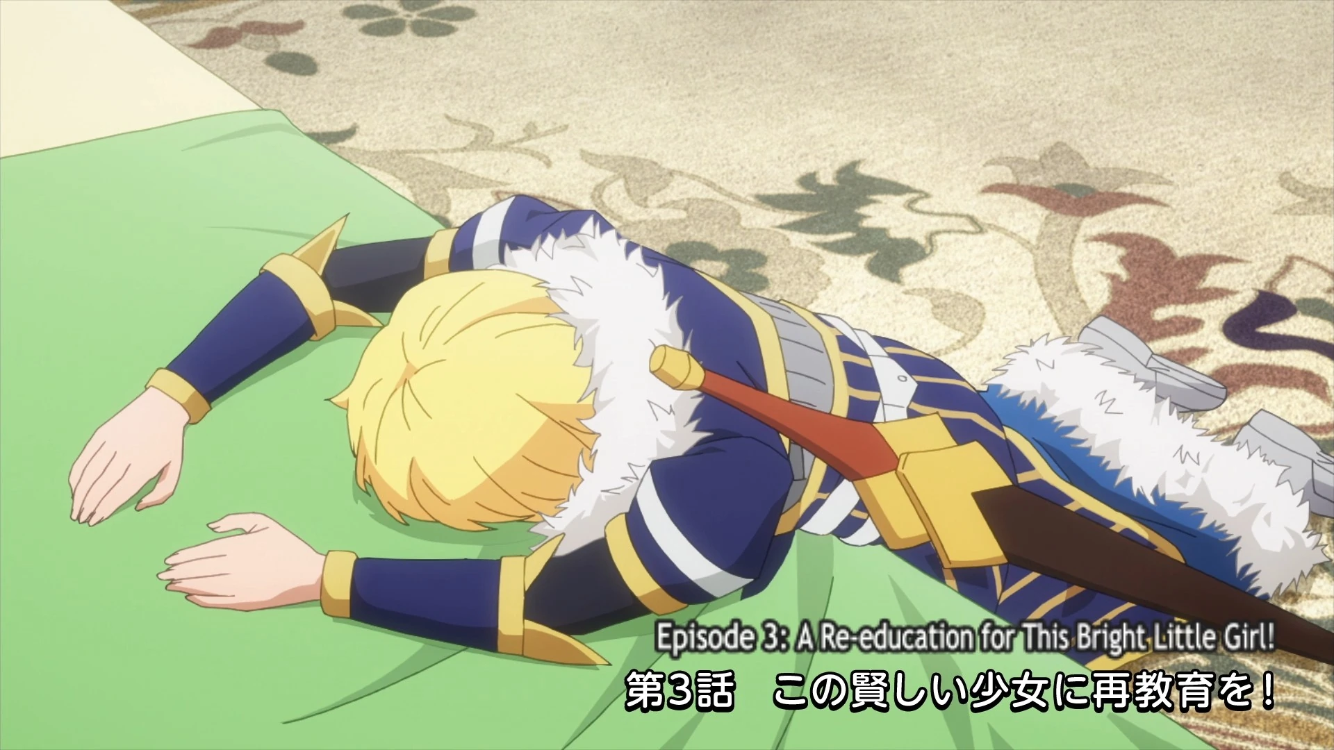 Waking up the next morning, Kazuma asks his assigned "Sebastian" Heidel for coffee while sitting in the way of an embarrassed Mary as she changes the sheets. He next excitedly stands up when Iris comes visiting, only to reveal that he had been sleeping in his trunks, something he later explains was because he had no pajamas with him. Kazuma then spends the next few days as Iris' playmate, much to Claire's vexation, as well as distract Iris from her lessons with Rain using a bamboo dragonfly. Iris later asks him to play a boardgame with her, which the confident Kazuma ends up making her continue playing until dusk in an attempt to rectify his losing streak. Finally winning a match after nightfall, Kazuma who acts cocky over it, much to Iris' exasperation, gifts the bamboo dragonfly to her. He next suggests her travelling to more places, where strange things such as a Demon beloved by locals and a Lich who survives on bread crusts exist. Iris who doubts it, however, laments that she has to be accompanied by knights or other escorts for security whenever going out.