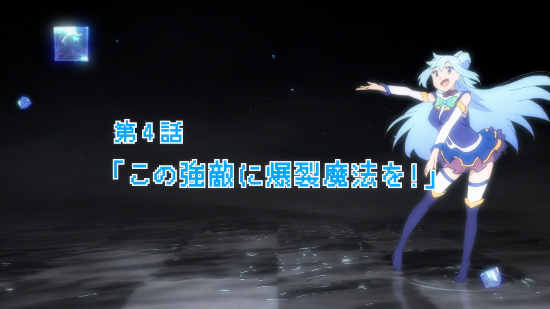 Kazuma considers abandoning the goal of defeating the Devil King, disregarding Aqua's desire to go back home. He then insults her at length, making her cry. Luna asks all adventurers to gather at the city gates, where the Devil King's General, Beldia the Dullahan, bellows his rage over someone casting Explosion on his castle every single day. As the other adventurers look at an innocent female wizard, Megumin steps forward and brags about being the number one wizard in the city, seeing this as an opportunity to eliminate Beldia, even though he only wishes for her to stop casting Explosions.