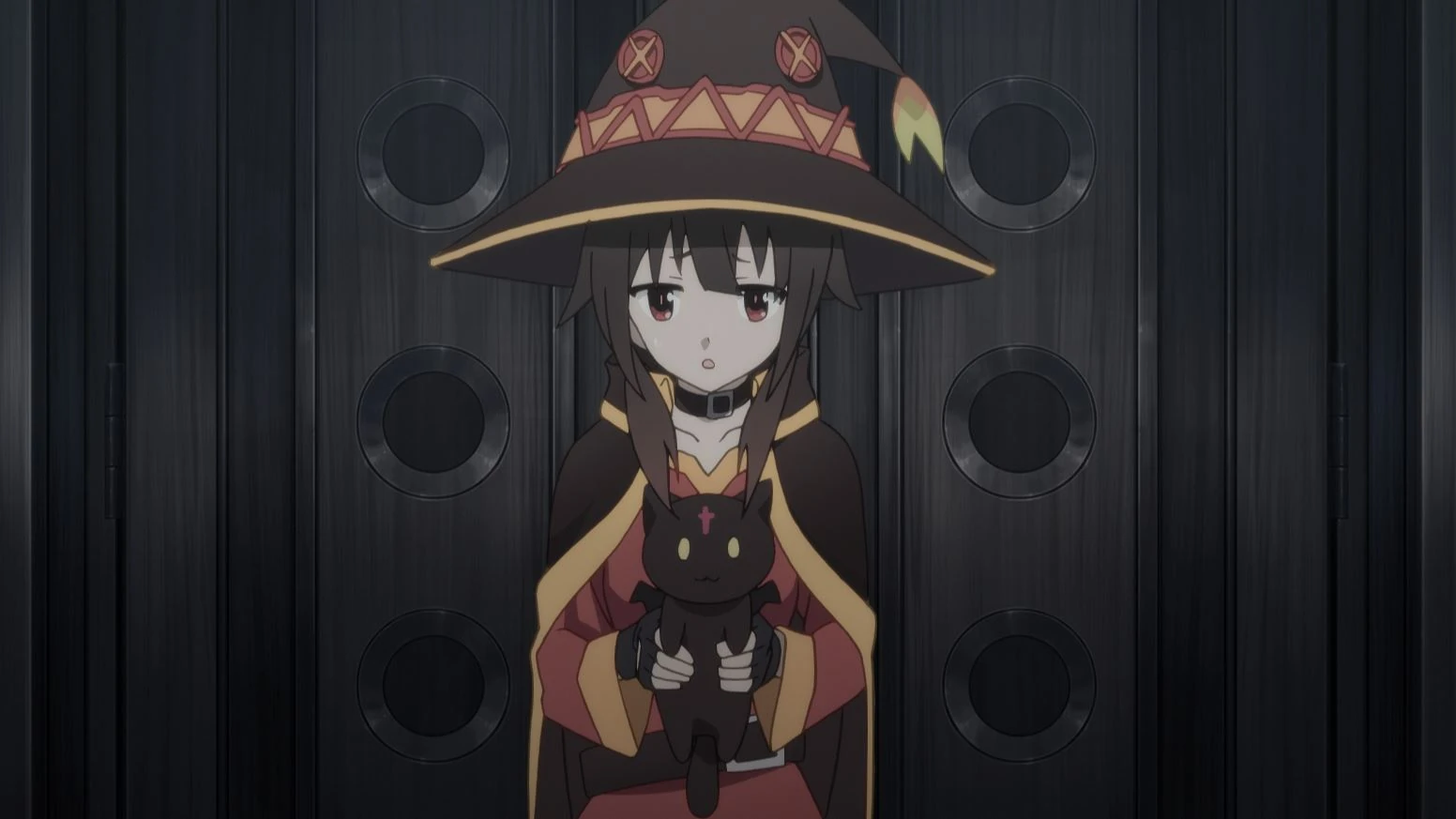 Megumin woke up to find Host asking if they had seen a big black beast, at which she disregarded the Crimson Demon style introduction he made, and instead fled in terror alongside Yunyun. Returning to the Guild at dusk all traumatised, they collected the rewards for the Giant Toads as well as reported about the Demon, then headed to the inn subsequent to Luna declaring the forest off-limits. Noticing on the way back Kazuma and an energetic Aqua finishing their work shift for the day, Megumin as she remembered Host finding her similar to somebody, discovered Chomusuke starved unto unconsciousness inside her inn room.[34]