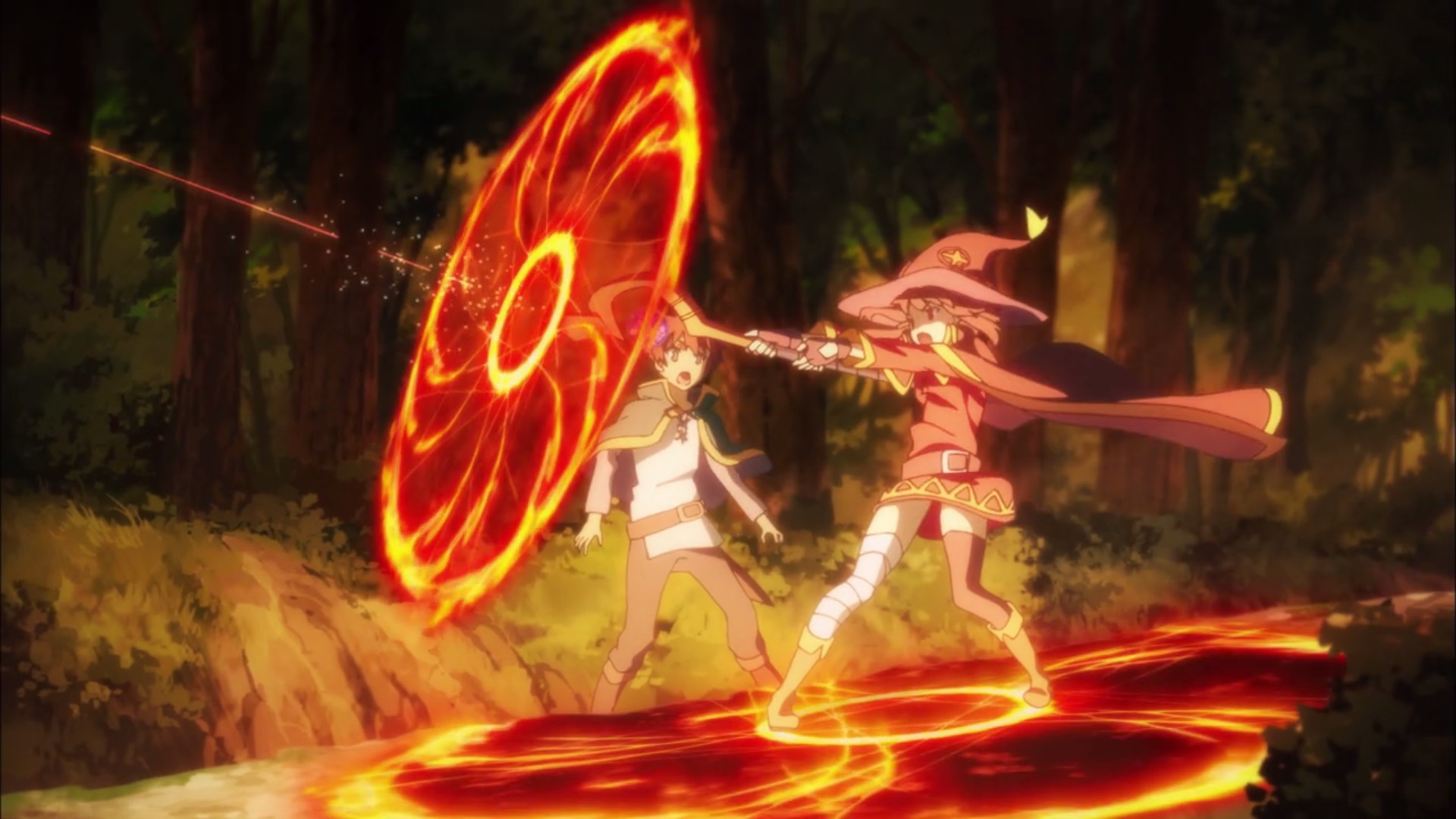 Following the replacement of a high quality manatite onto her magic rod thanks to the rewards from the Cabbage harvest, Megumin had Kazuma accompany her on daily Explosion exercises well away from the city. She decided to cast her Explosions on an abandoned castle because of it being big and hard enough, thus once each day during the ensuing week, Megumin would send an Explosion at the castle before being carried back by Kazuma.[44]