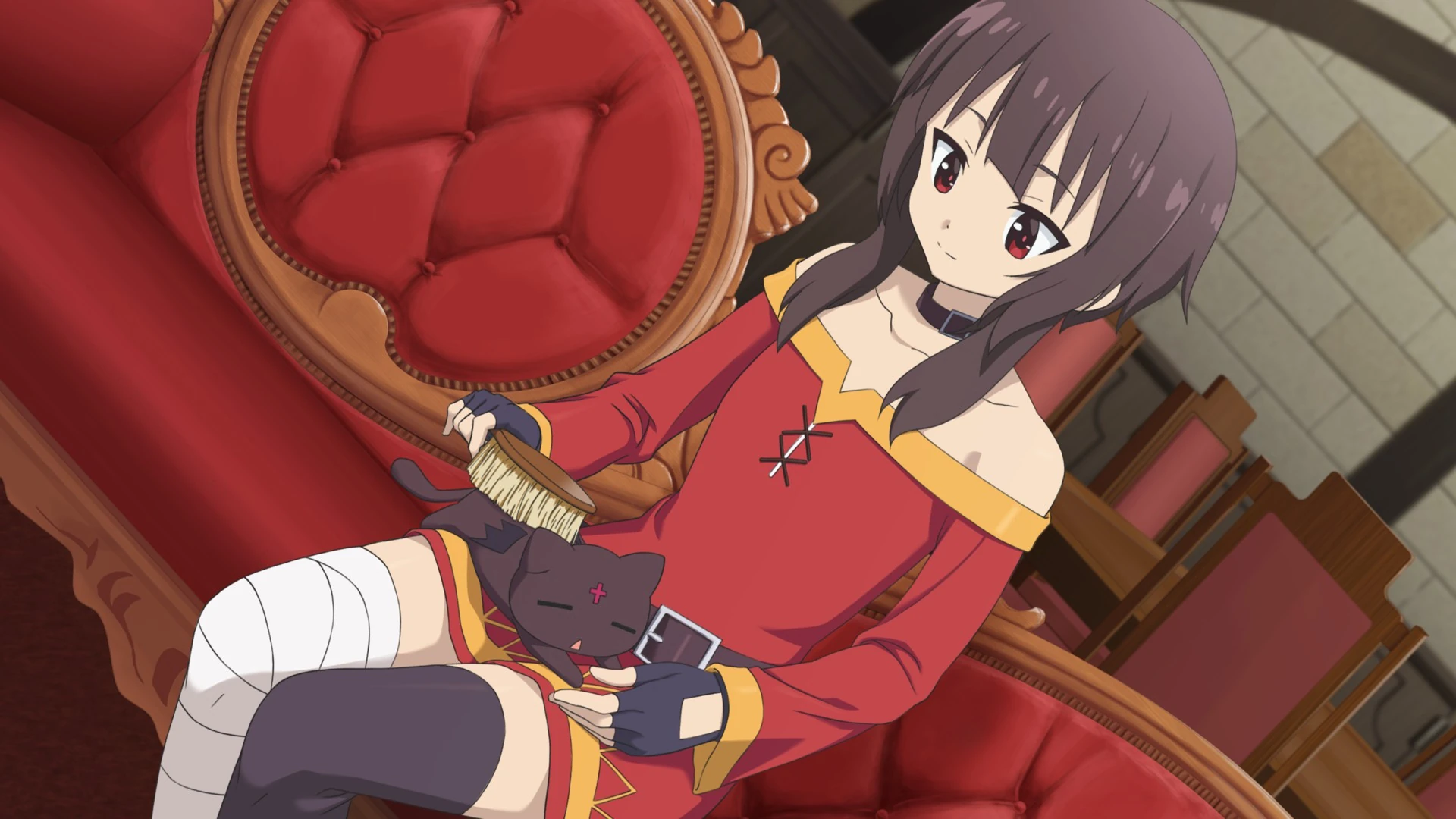 On a day the party took a break from questing, Megumin bringing Chomusuke on an outing to buy her a collar found herself tailed by Kazuma, before a hooded figure suddenly snatched away the cat whom he respectfully referred to. With Kazuma attracting the townsfolk's attention towards the catnapper in order to prevent his escape via the main roads, upon the figure slipping into an alleyway, Megumin became further impressed when Kazuma yelled about him being a weakling bounty monster in disguise to prompt people into chasing after the catnapper in their stead. She proceeded to follow Kazuma with hurrying ahead so they can cut the catnapper off, yet was surprised by his inhuman speed beating them to an open space in addition to holding Darkness hostage at knifepoint. Further convinced of him being in league with Arnes and Host when the catnapper called Chomusuke "Wolbach" and revealed his identity as a Demon, Megumin was once more amazed by Kazuma's luck as he Stole the knife, then became concerned that Aqua's Exorcism cast at the Demon also harmed Chomusuke. With the Demon also noticing it and switching to using Chomusuke as hostage, she apologetically told Kazuma how the Demon's target was her cat, but turned astonished when the Adventurer instead told her to prepare for Explosion that he also saw value in. As Kazuma Stole Chomusuke out of the catnapper's hands and allowed Megumin to finish off the Demon, she proceeded to inwardly complete her letter to the Crimson Demon Village about how she had found a great party to belong in.[67]