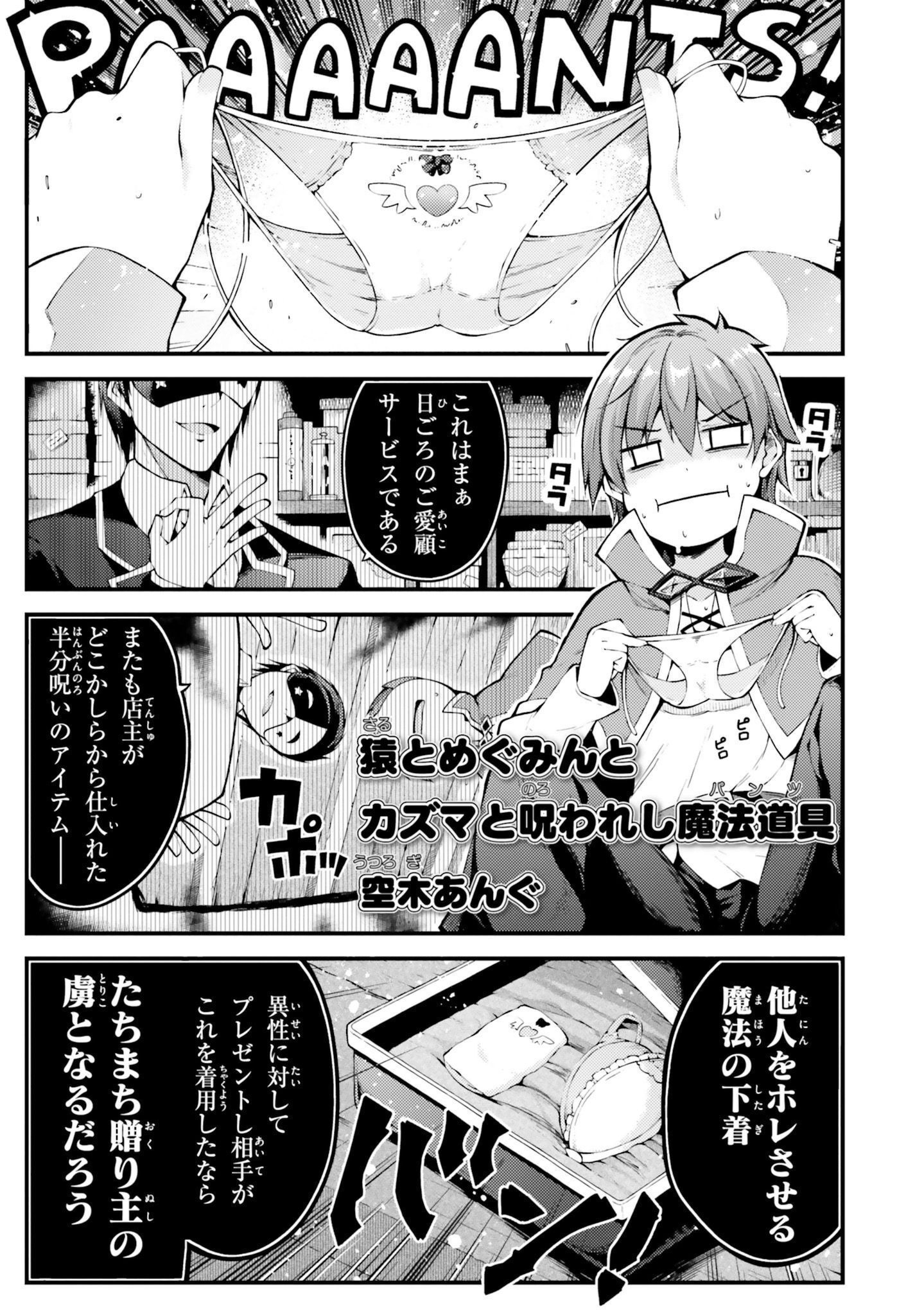 A Monkey, Megumin, Kazuma, and the Cursed Panties (猿とめぐみんとカズマと呪われし魔法道具, Saru to Megumin to Kazuma to Norowareshi Pantsu) is the fourteenth chapter of the Megumin Anthology manga series, and was illustrated by Utsurogi Angu.